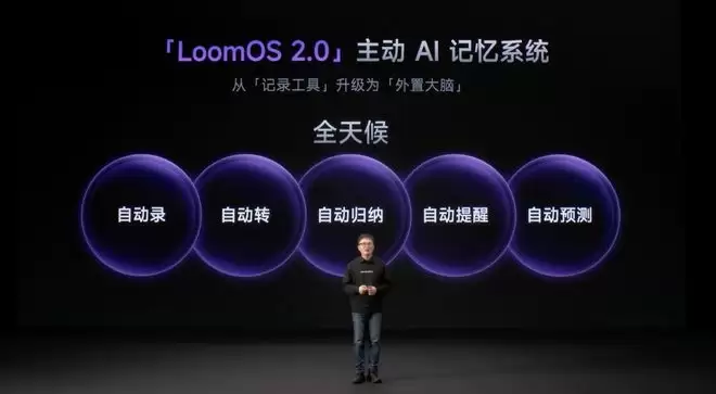 其搭载「LoomOS 2.0」主动AI记忆系统,可以主动实时采集音频视频信息,并进行转存和总结等。