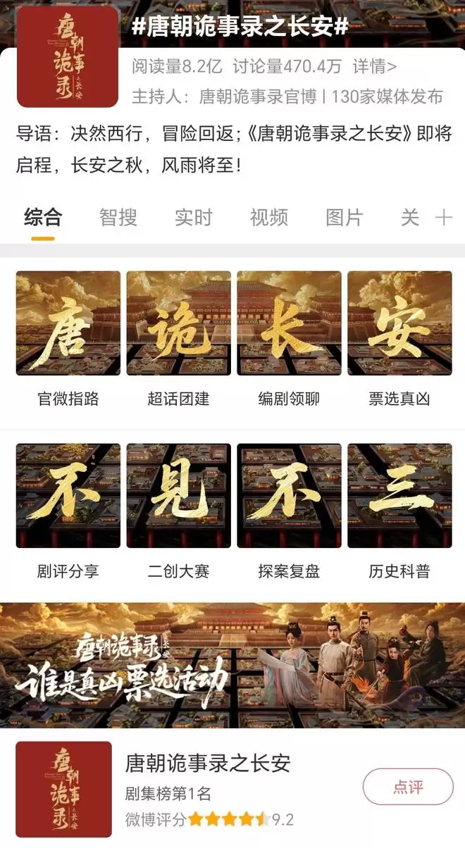 《唐朝诡事录之长安》的主话题内,最新设置了八大专区,剧评、案件复盘承载主剧情相关话题;历史科普一栏的历史向话题引发关于盛唐民俗的延展讨论;二创大赛、票选真凶调动剧迷深度参与,养成粉丝粘性。