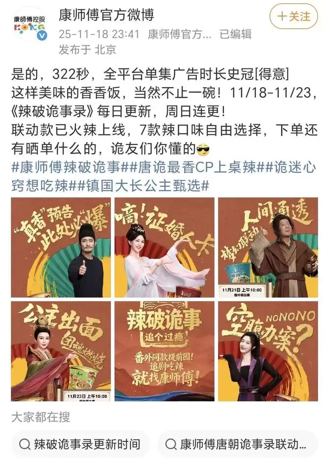 《唐朝诡事录之长安》剧播期间,合作品牌超35个。以康师傅为例,其化身为“唐诡最香CP”,联合原班演员推出7集短剧《辣破诡事录》,将康师傅面馆植入唐朝背景。借助与原剧高度匹配的制作和故事,大量观众收获了观看衍生番外的趣味体验。