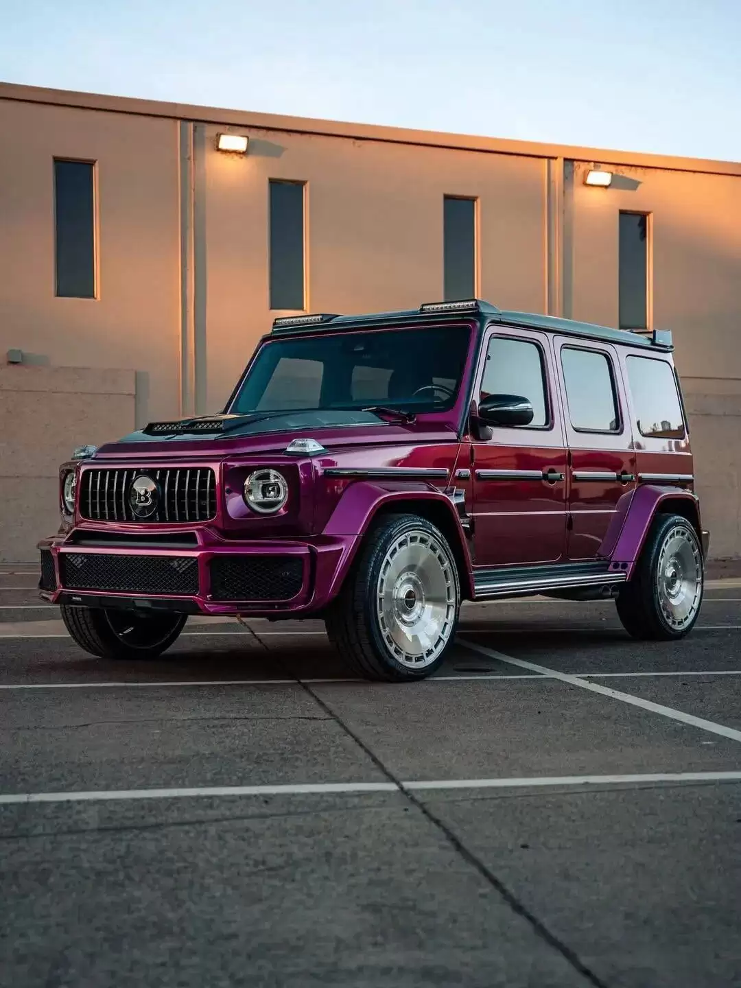 社交媒体账号@diamondautosport曝光的这组图片显示,全车采用高饱和度紫色车膜覆盖,在阳光下呈现出如金属流动般的独特质感。Brabus标志性的宽体套件赋予了车身更夸张的肌肉线条,从轮拱延伸至侧踏板的每一处细节都经过空气动力学优化。前引擎盖上新增的进气口与重新设计的保险杠,共同构成了凶悍的“鲨鱼脸”造型,搭配熏黑格栅与备胎架上的Brabus徽标,整车散发出不怒自威的强大气场。