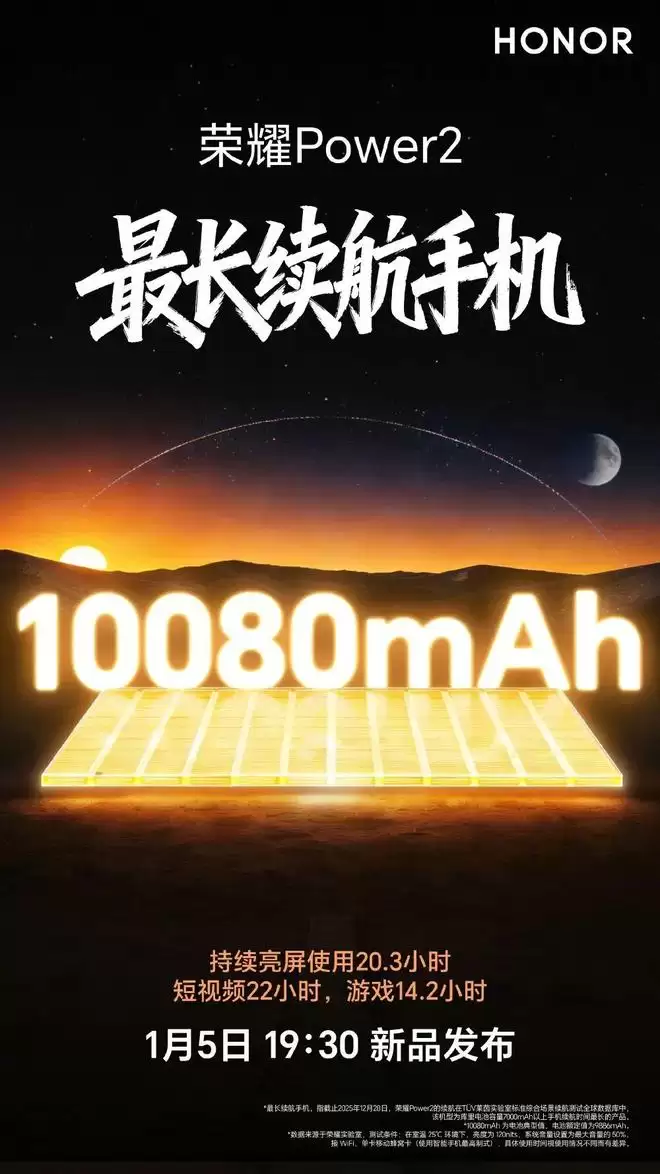荣耀手机官方现已确认,将于1月5日晚间19:30正式发布荣耀Power2新品。