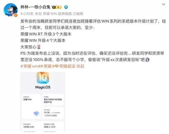 荣耀WIN 升级4个大版本