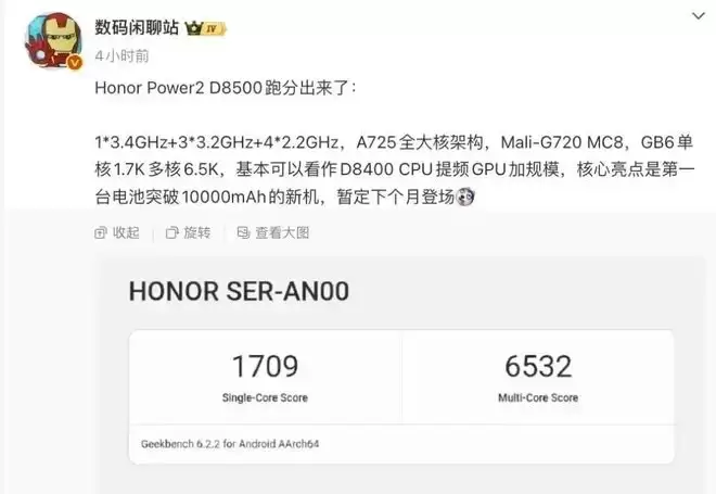 根据同一位博主曝出的一份跑分信息显示,这款型号为SER-AN00的新机,其单核成绩为1709分,多核成绩则达到了6532分。