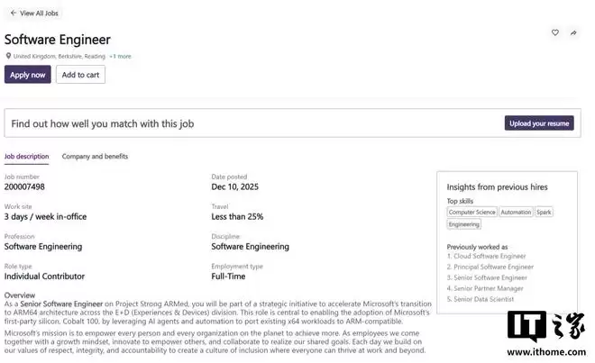 微软还提到:“该岗位将在第一方自研芯片 Cobalt 100 的应用方面处于核心位置,通过 AI 智能体与自动化技术,将现有 x64 工作负载移植到 ARM 兼容平台”。