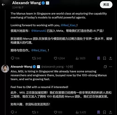 Meta超级智能实验室的负责人Alexandr Wang也转发了相关消息,并表示Manus团队在探索当前模型能力上限方面处于世界前沿水平。此外,MSL目前正在新加坡招聘,Manus团队的百名成员已悉数加入当地的Meta组织。