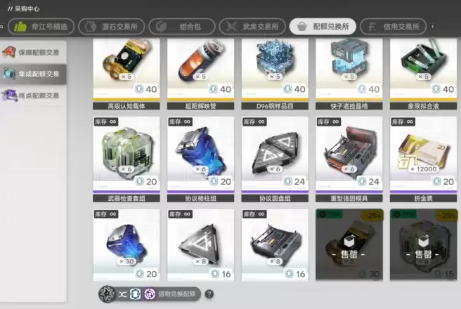 同时,配额需要在特定的场景进行使用。不同来源和不同类型的配额,只能在对应的交易分区内使用,无法跨区流通。各交易分区内的道具都设有兑换限制,包括单次兑换上限和累计兑换数量上限。有些物资还需要特殊的前置条件,完成之后才能解锁兑换资格。在资源转换场景中,支持玩家将养成过程中产生的稀有素材,转化为对应类型的配额,实现资源的循环利用。