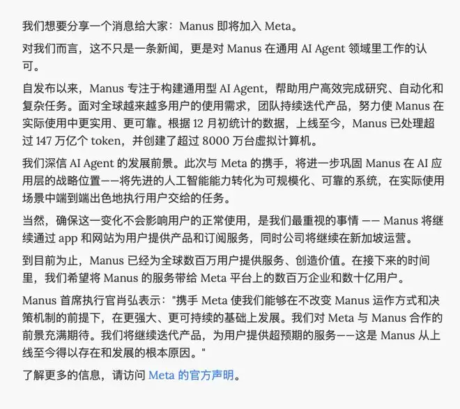 12月30日,Manus官方向外发布声明称,“Manus即将加入Meta”。未来,Manus将继续通过其App为用户提供产品与订阅服务,同时团队也会保持在新加坡的独立运营。