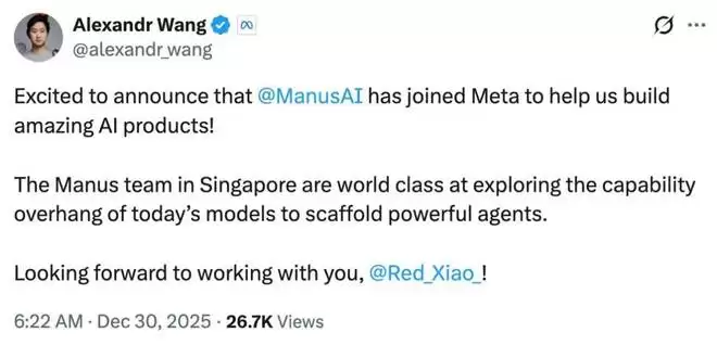 我们想分享一个消息给大家:Manus即将加入Meta。