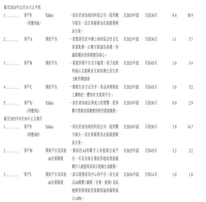 这其中,MiniMax合作的前五大客户也在招股书中进行了相应披露,比如2024、2024年都位列前五的小红书、阅文集团和金山办公(WPS),2025年的企业指向性不强,比较明显的是一家AI数字人及视频合成平台,结合MiniMax披露信息推测为Veed。