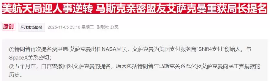 早在去年12月,艾萨克曼就被特朗普提名为NASA局长候选人,但今年5月该提名曾被撤回。当时有分析指出,提名被搁置的部分原因是他与马斯克关系密切——而特朗普与马斯克在夏季曾爆发激烈争执。