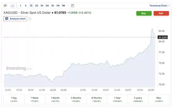十二月份以来,白银价格一路飙升,这是整个贵金属市场火热行情的一部分。周一亚洲交易时段,现货白银一度暴涨超过5%,升至每盎司83美元上方,再次刷新历史高位。截至目前,现货白银报约81美元,日内上涨逾2%,实现了连续第六个交易日的上涨。