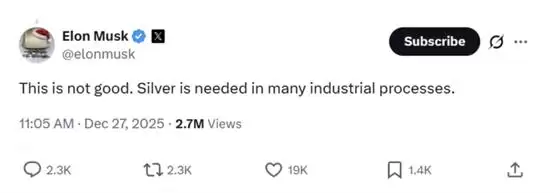 12月27日,马斯克在社交媒体上对银价持续上涨表达了担忧,直言这对工业发展“不是好事”。