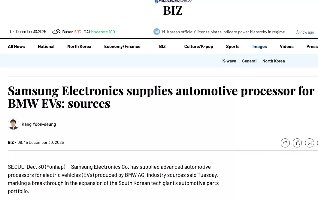 【环球网科技综合报道】12月30日消息,据韩联社报道,三星电子在汽车零部件领域取得新进展,为宝马基于全新纯电平台“新世代架构(Neue Klasse)”打造的首款量产车型——新款iX3纯电动SUV,供应了其专为高端智能汽车设计的5纳米制程芯片Exynos Auto V720。