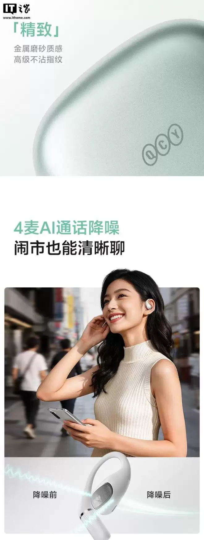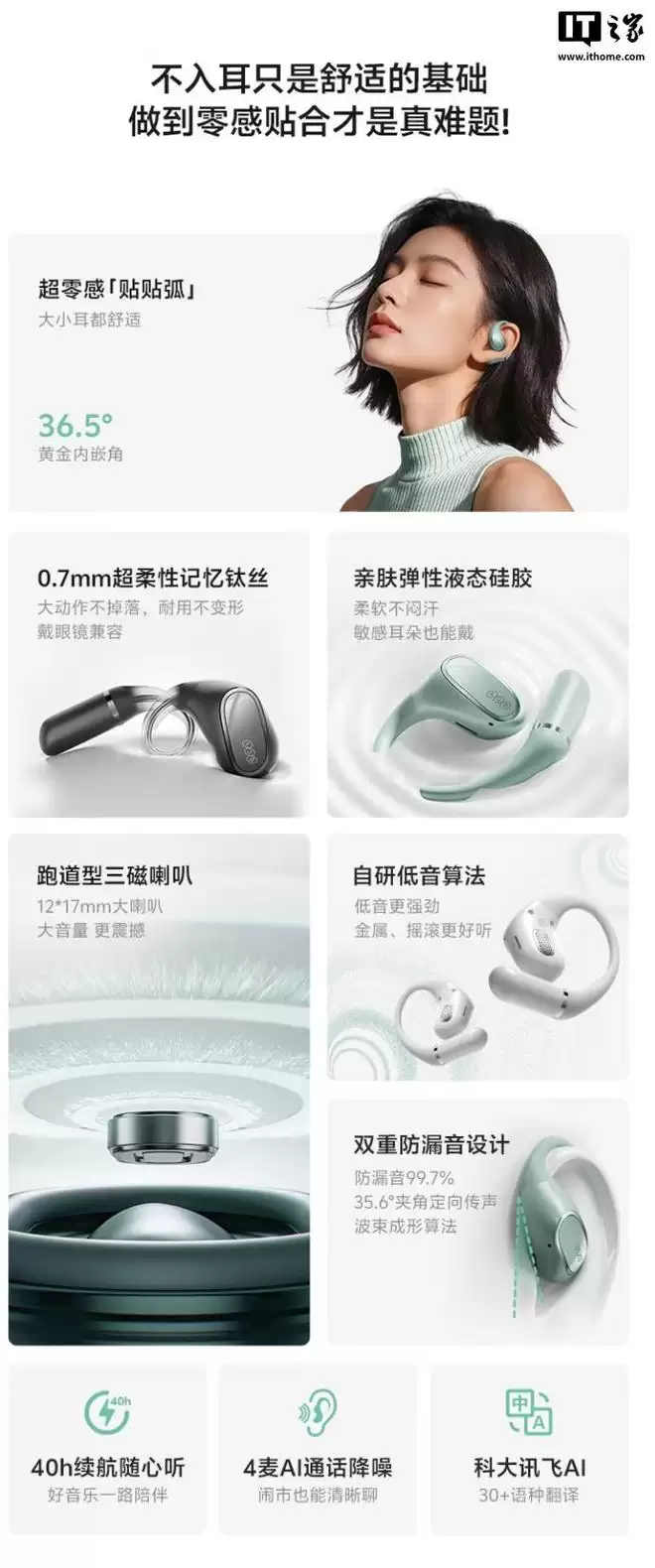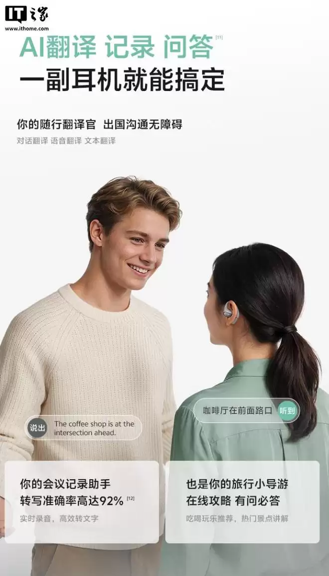 此外,这款耳机还搭载 4 麦克风矩阵,支持通话降噪,单体续航 10 小时、整体续航 40 小时,支持科大讯飞 AI 翻译,还拥有双设备连接、360° 影院环绕、IPX5 防水等特性。