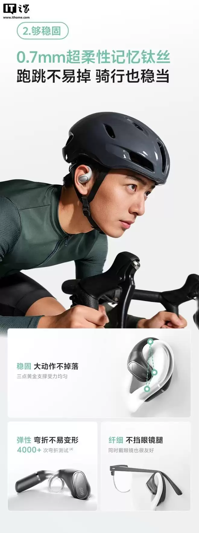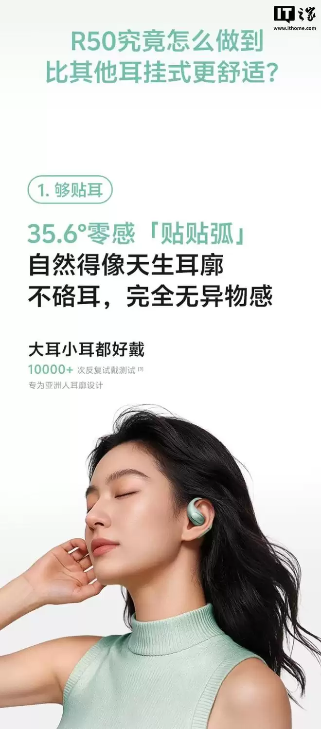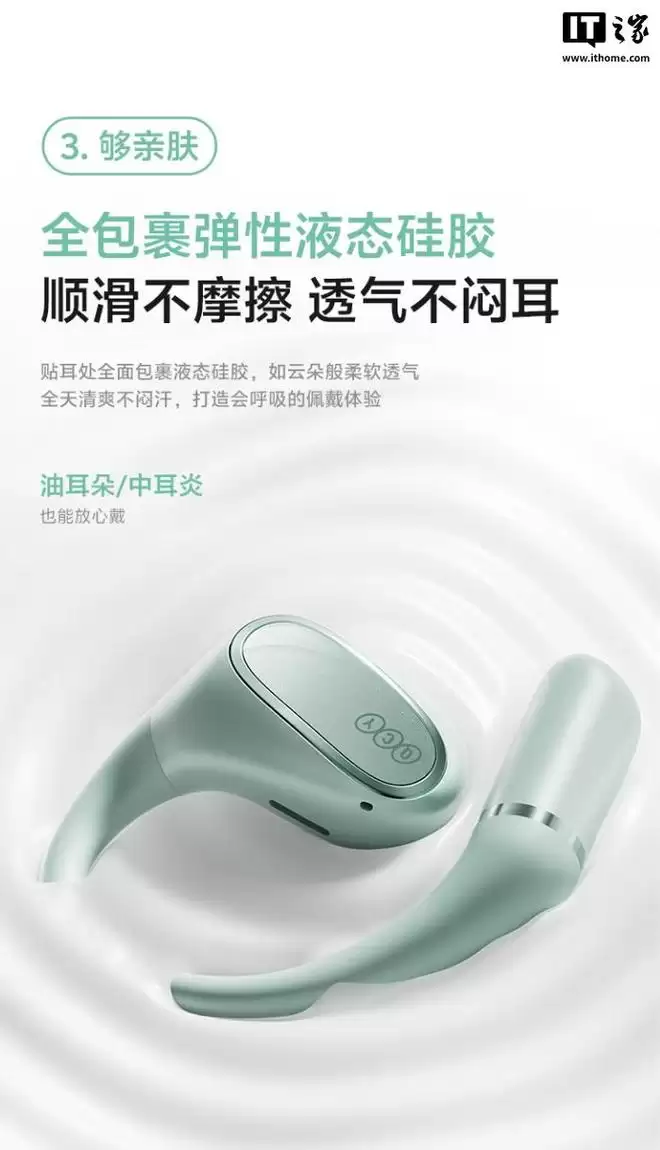 据介绍,这款耳机配备全包裹弹性液态硅胶外壳,号称“透气不闷耳”,拥有 35.6° 零感弧廓,可实现“全天零感佩戴”,内嵌 0.7mm 超柔性记忆钛丝,适配骑行、跑步等运动场景,可让耳机更加稳固不易掉。