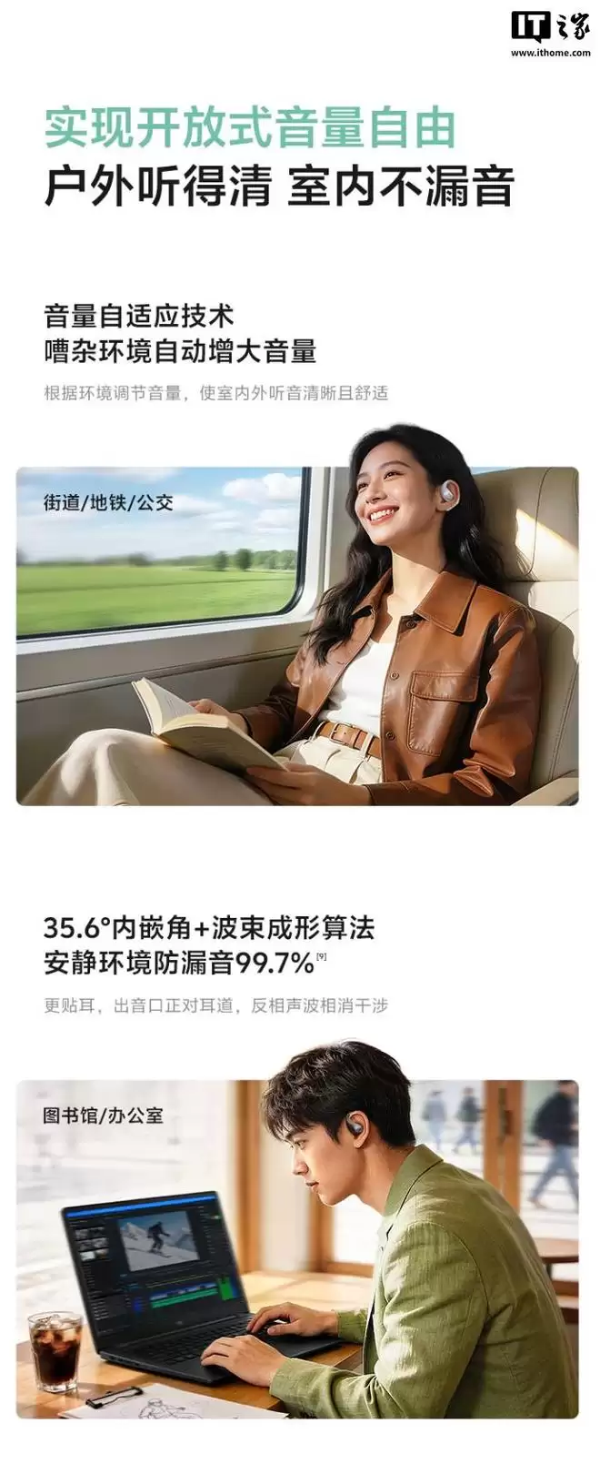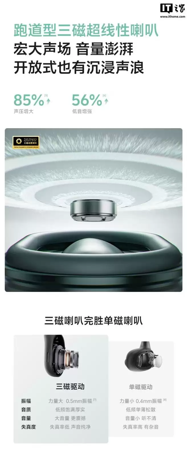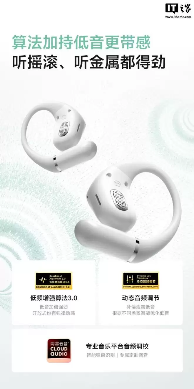 参数方面,这款耳机搭载跑道形三磁超线性喇叭,振幅可达 0.5mm,声压增大 85%、低音增强 56%,自带低音增强算法、动态音频调节,可让低频更加浓厚,支持自适应音量调节技术,可根据环境决定音量大小,还配有波束成形算法,减少开放式耳机常见的漏音现象。