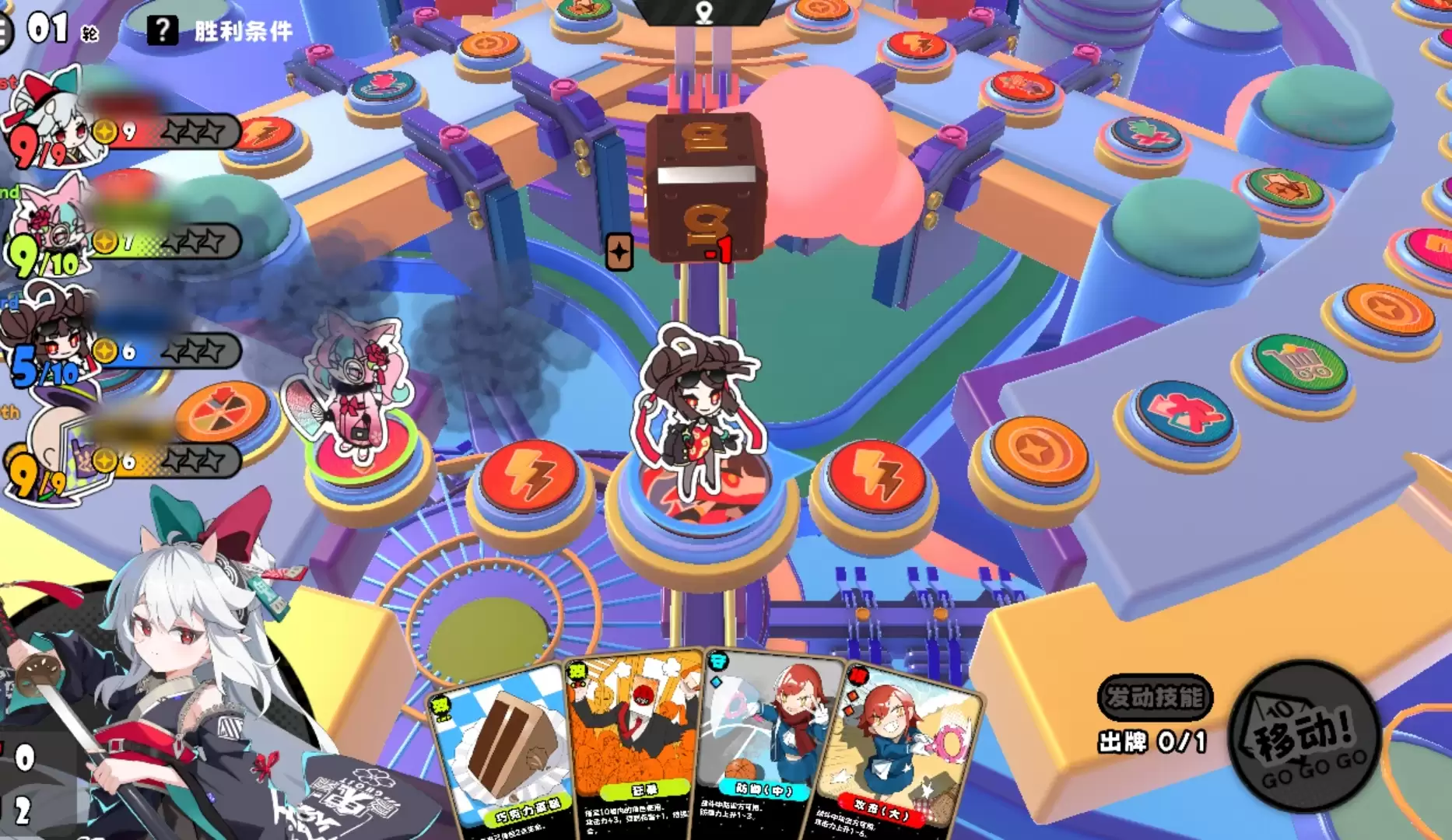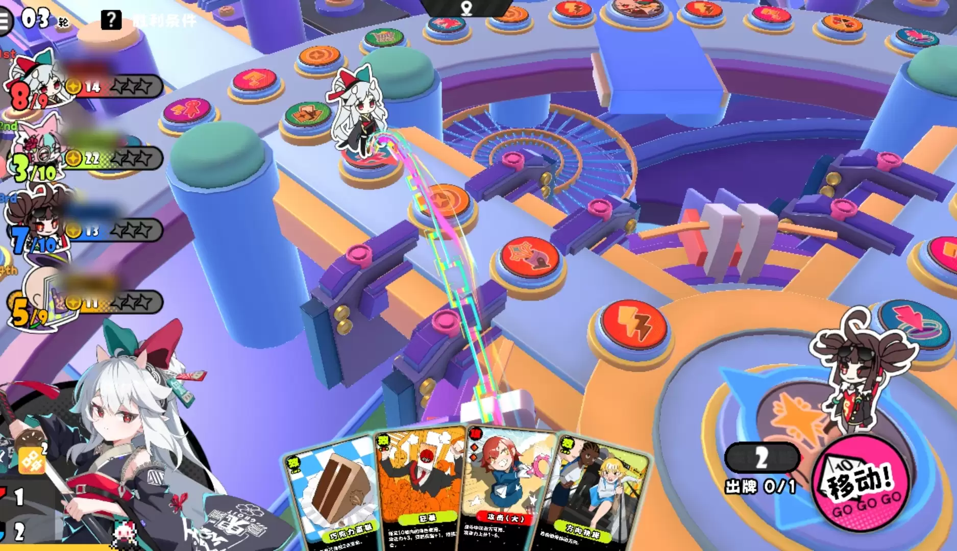 因此,游玩这张图的策略最好是多在外圈活动,通过踩外圈的奖励格或利用手牌效果来进行运营,慢慢地进行星币的积累。也推荐多使用风水师、看板娘等角色,他们的技能有助于安全探索。当然,玩家若想通过对战来取胜,也可以选择茉莉、午夜闪光这类每次行动都能获得额外移动点数的角色。前者能通过积攒移动点来提升属性,后者则可在开启主动技能后不进入战斗,在额外移动点的加持下,她们规避列车的能力也非常出色。