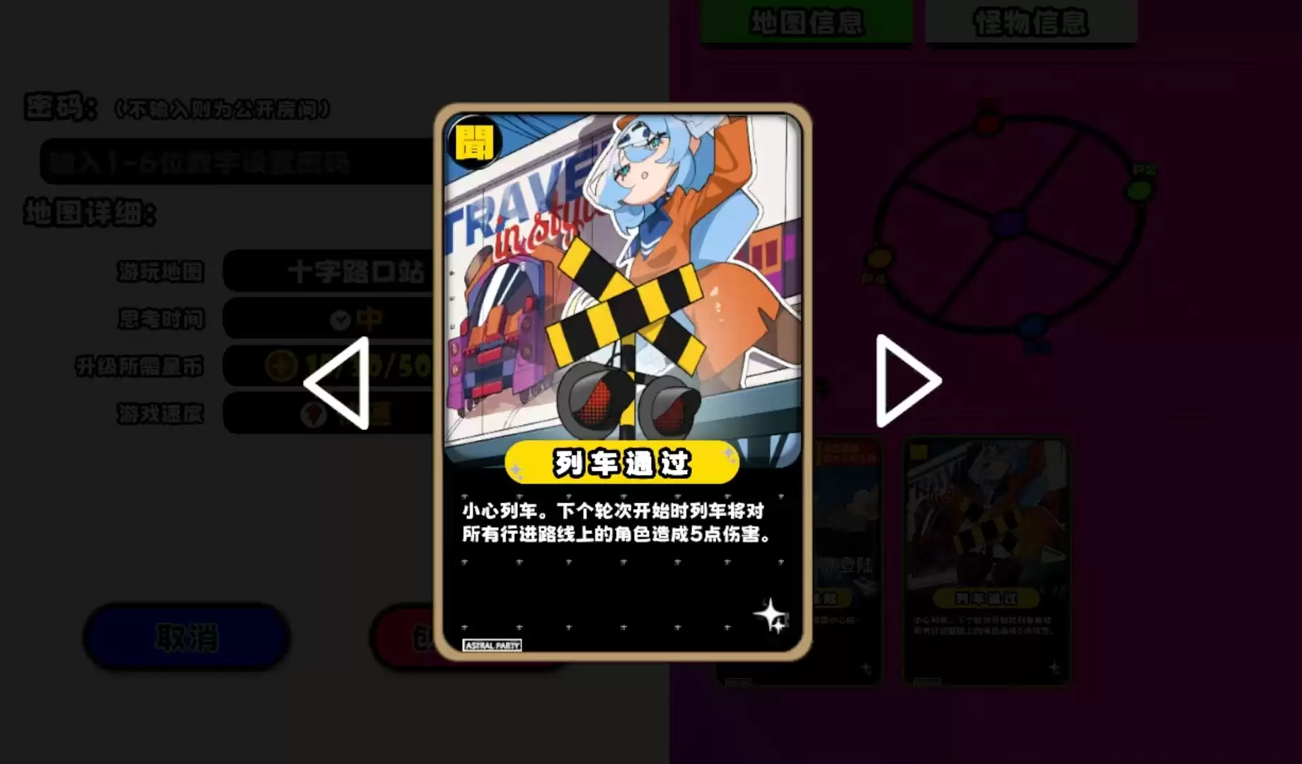 十字路口站的核心特色是“列车通过”事件。从第一回合开始,每隔三个回合就会出现列车通过的提示,并以红光显示其即将通过的路径。在所有玩家行动完毕后,列车会立即进场,对仍停留在路径上的玩家造成5点伤害,且此次伤害足以将玩家的血量直接降至零。因此,务必多加关注游戏的事件提示,并时刻留意地图上的红光显示,及时让角色从列车路径上撤出,是游玩这张图的关键。此外,十字路口站同样有小怪兽事件,在小怪兽生成后,它会追着玩家跑并进行攻击。