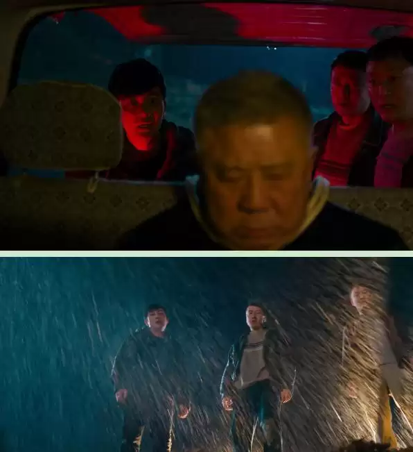 在红色的车尾灯下,刘天也带着兄弟勒死马金的画面,够悬疑、也够惊悚。