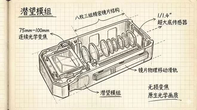 你看,它不仅把传感器做到了1/1.4英寸这种接近主摄的级别,还塞进去了一个“八枚三组”的结构,实现了真正的连续光学变焦。