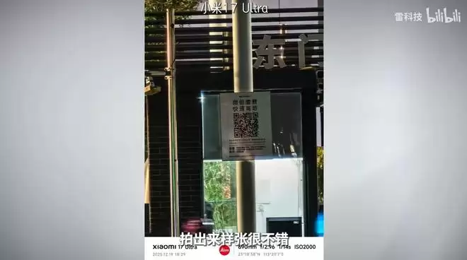 为了验证这一点,我们在光线极差的夜间环境,拿了隔壁某果的旗舰机做对比。结果很真实,某果的长焦拍出来基本是乌漆嘛黑一片,别说扫码了,连码贴在哪儿都找不到,而小米17 Ultra硬生生把夜景拍出了黄昏的亮度。