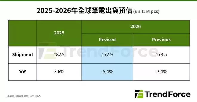 TrendForce再下调预测:2026全球笔记本电脑出货量同比减5.4%