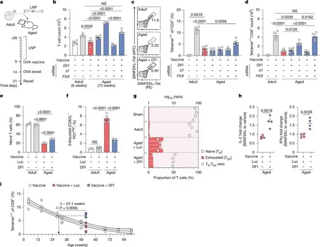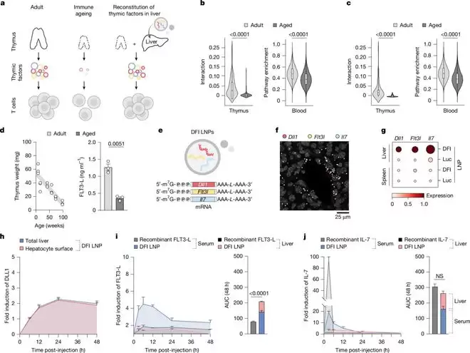随即,肝细胞便启动了“代工模式”,开始根据 mRNA 的指令大量生产 DLL1、FLT-3 和 IL-7 蛋白(合称“DFI”),并将它们分泌到血液中。肝脏就这样被暂时改造成了一个功能性胸腺。