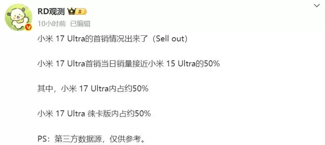 而小米17 Ultra首销即接近前代50%的销量,且在定价更高的前提下达成这一成绩,足以证明市场对其产品力的认可。