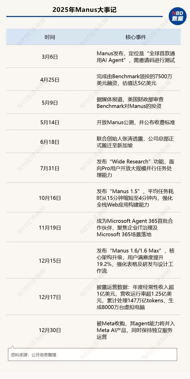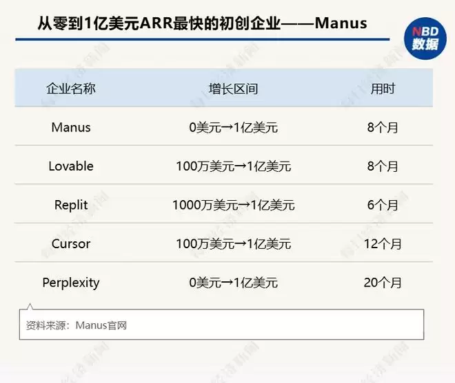 6月,联合创始人张涛宣布公司总部迁至新加坡;12月17日,Manus最新披露ARR突破1亿美元,营收运行率达1.25亿美元,成为ARR从零到1亿美元最快的初创企业。