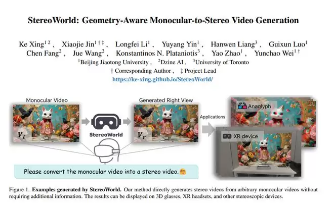 这项突破性研究由北京交通大学、Dzine AI、多伦多大学和Visual Intelligence + X国际联合实验室的研究团队共同完成,核心研究成员包括邢轲、李龙飞、尹宇阳、梁汉文、罗贵恂、方晨、王珏、康斯坦丁诺斯·普拉塔尼奥蒂斯、金晓杰、赵瑶和魏云超等学者。这项名为"StereoWorld"的研究成果于2025年12月发表,编号为arXiv:2512.09363v1,为单镜头视频到立体视频的转换技术带来了革命性突破。