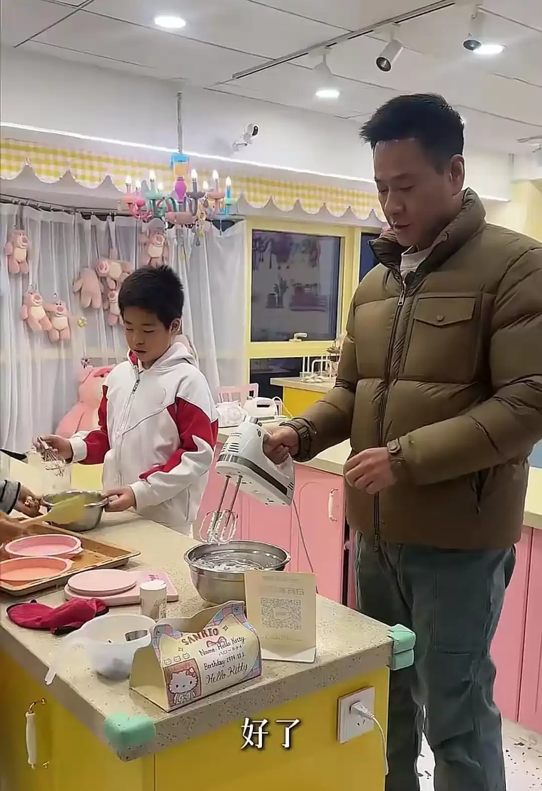 镜头里这对“直男组合”分工明确:连奕名撸起袖子搅面糊,那手腕发力的架势活像在拍武打戏;大福踮着脚打蛋清,打蛋器甩出的泡沫溅到鼻尖也浑然不觉,活脱脱一个缩小版“硬汉萌娃”。