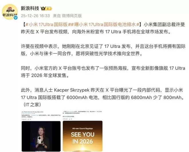 据悉,此前有消息曝光过一段内部代码,显示小米 17 Ultra 国际版搭载了 6000mAh 电池,相比国行版的 6800mAh 少了 800mAh。