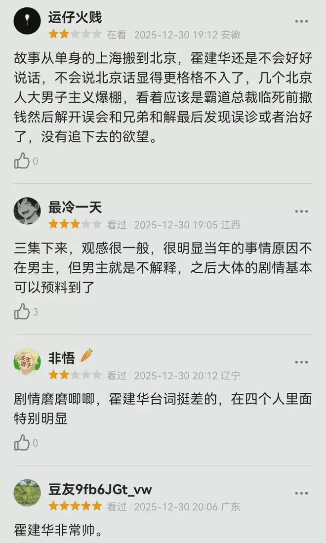 一边吐槽剧情老套、角色悬浮,还有观众觉得霍建华的台词腔调令人出戏;另一边又被胡同里的兄弟日常打动,觉得田雨等人演的市井烟火气还算有看头。