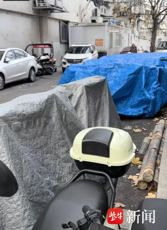 盖着防雨布的待售库存旧国标电动车。任国勇 摄
