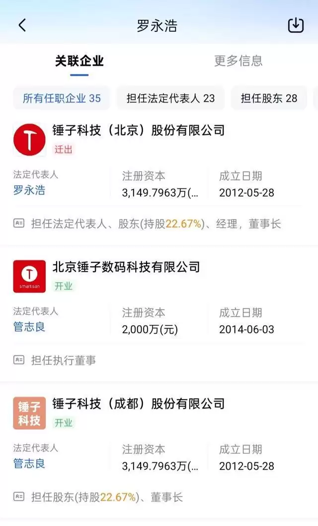 爱企查App显示,罗永浩名下共计关联**30余家企业**,具体包括北京锤子数码科技有限公司、成都野望数码科技有限公司、北京云上卓智咨询中心(有限合伙)等,其版图涉及数码、教育、投资管理等多个领域,其中**10余家**为开业状态。罗永浩在上述企业中普遍担任董事长、执行董事、法定代表人等重要职务,并持有其中**近30家**企业的股份。