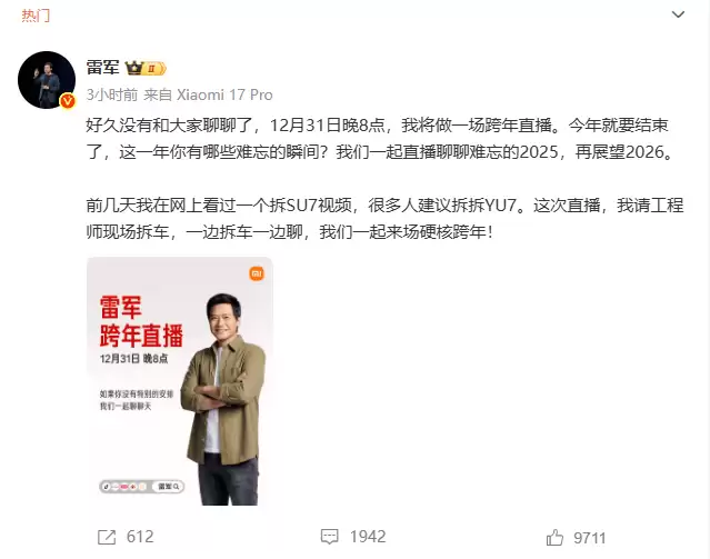 小米集团董事长兼CEO雷军近日通过社交平台宣布,将于跨年夜当晚开启一场特别直播活动。这场定于12月31日20时举行的直播,将采用技术拆解与互动交流相结合的形式,为观众带来一场别开生面的科技盛宴。
