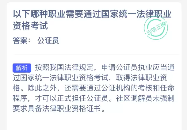 哪些职业必须通过国家统一法律职业资格考试才能上岗?【蚂蚁新村每日一题】2025年12月30日的题目已经公布啦!坚持答题,积累木兰币,就能加速小镇建设。答对这道题,马上就能享受“产速+3/时”的加速奖励!今天的正确答案是【公证员】。根据我国法律规定,申请公证员执业应当通过国家统一法律职业资格考试,取得法律职业资格。