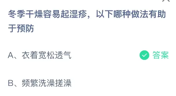 到了冬天,皮肤干燥更容易引发湿气重的问题,那么哪些方法能帮助预防呢?支付宝小鸡课堂开课啦!每天抽出一点时间答题赚饲料,喂养小鸡就能贡献爱心了呢!既轻松又有意义!2025年12月31日蚂蚁庄园的课堂题目正确答案是【衣着宽松透气】,冬季皮肤干燥容易诱发湿气相关的皮肤不适,穿着宽松透气的衣物有助于预防。