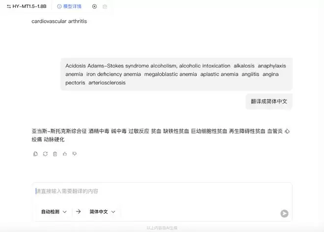 智东西也上手尝试了一下,我们上传了一系列医学术语,让其翻译成中文。在反应速度上,腾讯混元翻译模型1.5就很快输出了翻译结果,几乎没有反应时间。与原文对照看,其翻译的成果准确度为100%。