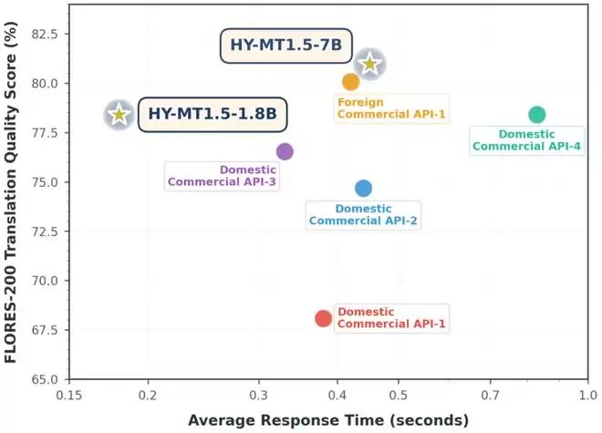 在翻译质量与响应效率上,HY-MT1.5-1.8B模型在FLORES-200质量评估中取得了约78%的分数,同时平均响应时间仅为0.18秒,超越主流商用翻译API。