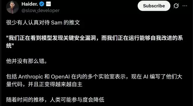 奥特曼之前的推文里也提到过,「我们正在看到模型发现关键安全漏洞,而我们正在运行能够自我改进的系统」。