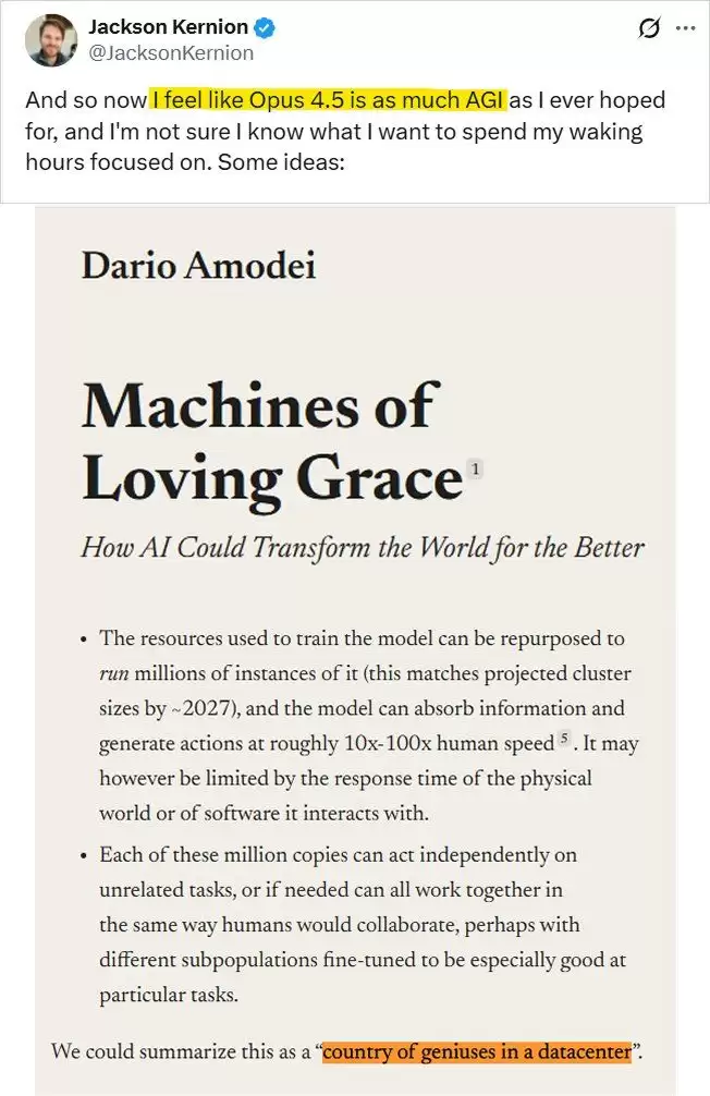 最近,也有一位Anthropic员工表示,自己认为Claude Opus 4.5已经接近了AGI。