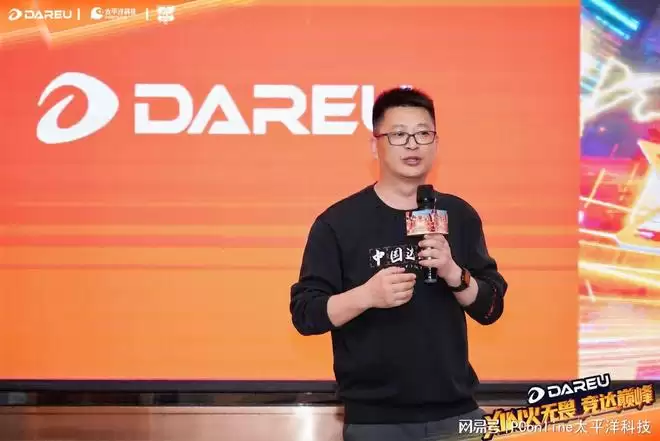 达尔优电子音频有限公司总经理-曾卫平登台致辞,回顾了达尔优2025年的成长与突破,感谢粉丝一路相伴。他强调,达尔优将继续坚持创新驱动,为玩家提供更优质的外设装备,助力中国电竞事业发展。