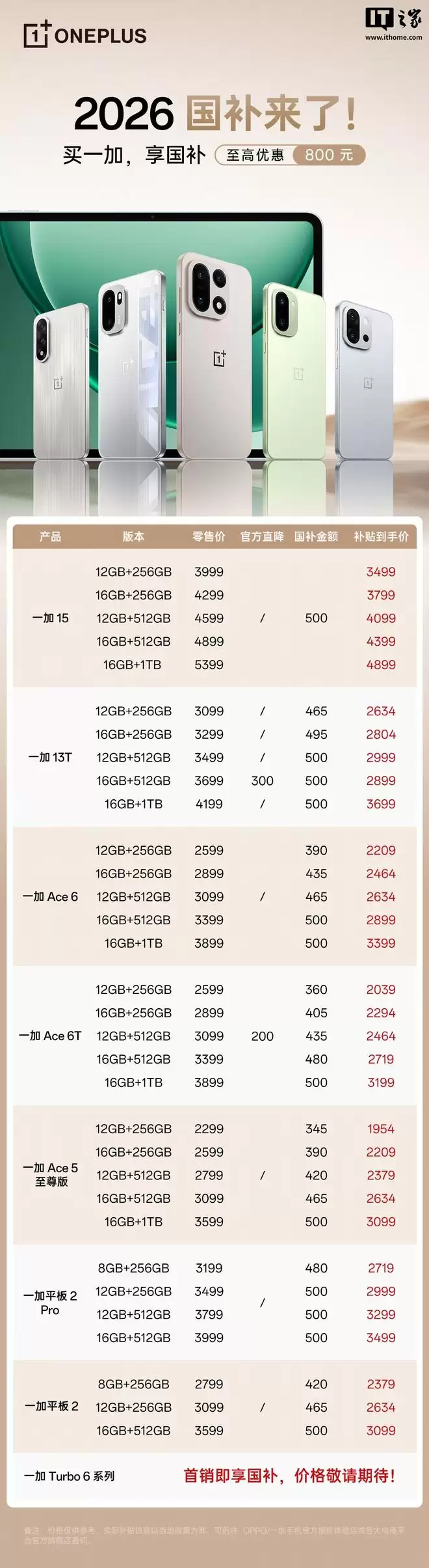 一加 15:12GB+256GB版:零售价3999元,国补金额500元,补贴到手价3499元;16GB+256GB版:零售价4299元,国补金额500元,补贴到手价3799元;12GB+512GB版:零售价4599元,国补金额500元,补贴到手价4099元;16GB+512GB版:零售价4899元,国补金额500元,补贴到手价4399元;16GB+1TB版:零售价5399元,国补金额500元,补贴到手价4899元。 一加 13T:12GB+256GB版:零售价3099元,国补金额465元,补贴到手价2634元;16GB+256GB版:零售价3299元,国补金额495元,补贴到手价2804元;12GB+512GB版:零售价3499元,国补金额500元,补贴到手价2999元;16GB+512GB版:零售价3699元,最新直降300元,国补金额500元,补贴到手价2899元;16GB+1TB版:零售价4199元,国补金额500元,补贴到手价3699元。 一加 Ace 6:12GB+256GB版:零售价2599元,国补金额390元,补贴到手价2209元;16GB+256GB版:零售价2899元,国补金额435元,补贴到手价2464元;12GB+512GB版:零售价3099元,国补金额465元,补贴到手价2634元;16GB+512GB版:零售价3399元,国补金额500元,补贴到手价2899元;16GB+1TB版:零售价3899元,国补金额500元,补贴到手价3399元。 一加 Ace 6T:12GB+256GB版:零售价2599元,最新直降200元,国补金额360元,补贴到手价2039元;16GB+256GB版:零售价2899元,最新直降200元,国补金额405元,补贴到手价2294元;12GB+512GB版:零售价3099元,最新直降200元,国补金额435元,补贴到手价2464元;16GB+512GB版:零售价3399元,最新直降200元,国补金额480元,补贴到手价2719元;16GB+1TB版:零售价3899元,最新直降200元,国补金额500元,补贴到手价3199元。 一加 Ace 5 至尊版:12GB+256GB版:零售价2299元,国补金额345元,补贴到手价1954元;16GB+256GB版:零售价2599元,国补金额390元,补贴到手价2209元;12GB+512GB版:零售价2799元,国补金额420元,补贴到手价2379元;16GB+512GB版:零售价3099元,国补金额465元,补贴到手价2634元;16GB+1TB版:零售价3599元,国补金额500元,补贴到手价3099元。 一加平板 2 Pro:8GB+256GB版:零售价3199元,国补金额480元,补贴到手价2719元;12GB+256GB版:零售价3499元,国补金额500元,补贴到手价2999元;12GB+512GB版:零售价3799元,国补金额500元,补贴到手价3299元;16GB+512GB版:零售价3999元,国补金额500元,补贴到手价3499元。 一加平板 2:8GB+256GB版:零售价2799元,国补金额420元,补贴到手价2379元;12GB+256GB版:零售价3099元,国补金额465元,补贴到手价2634元;16GB+512GB版:零售价3599元,国补金额500元,补贴到手价3099元。