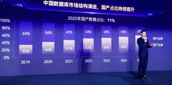 据沙利文大中华区合伙人兼董事总经理杨晓骋透露,“中国数据库市场中,国产数据库品牌占比从2019年的35%提升到了2025年的71%。”