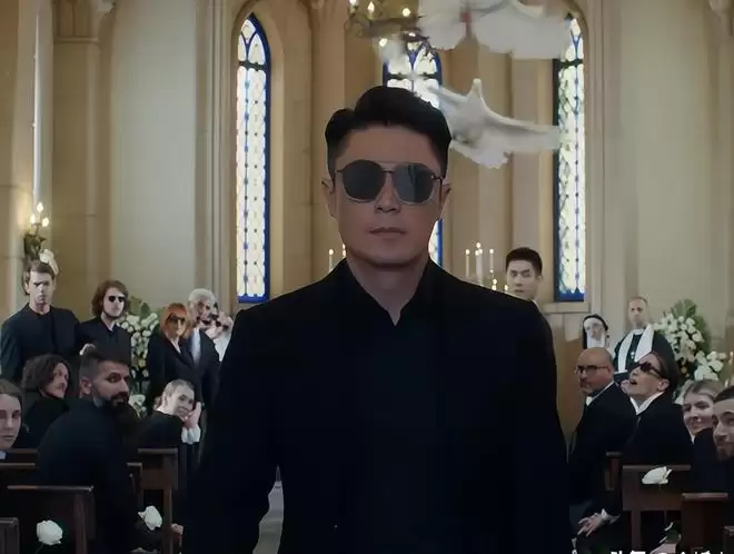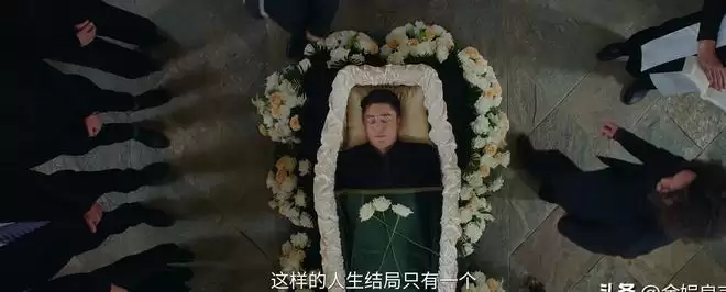 而葬礼的主人公不是别人,正是霍建华本人,他正躺在棺材中间安详地紧闭双眼。