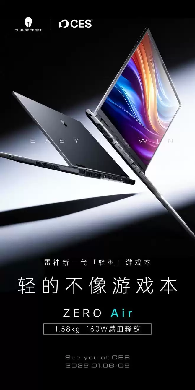 据IT之家12月31日消息,THUNDEROBOT雷神今日透露,其即将在CES 2026上发布的英特尔“Panther Lake”平台笔记本电脑ZERO Air,将支持160W“满血”性能释放,而其1.58kg的机身却“轻得不像游戏本”。