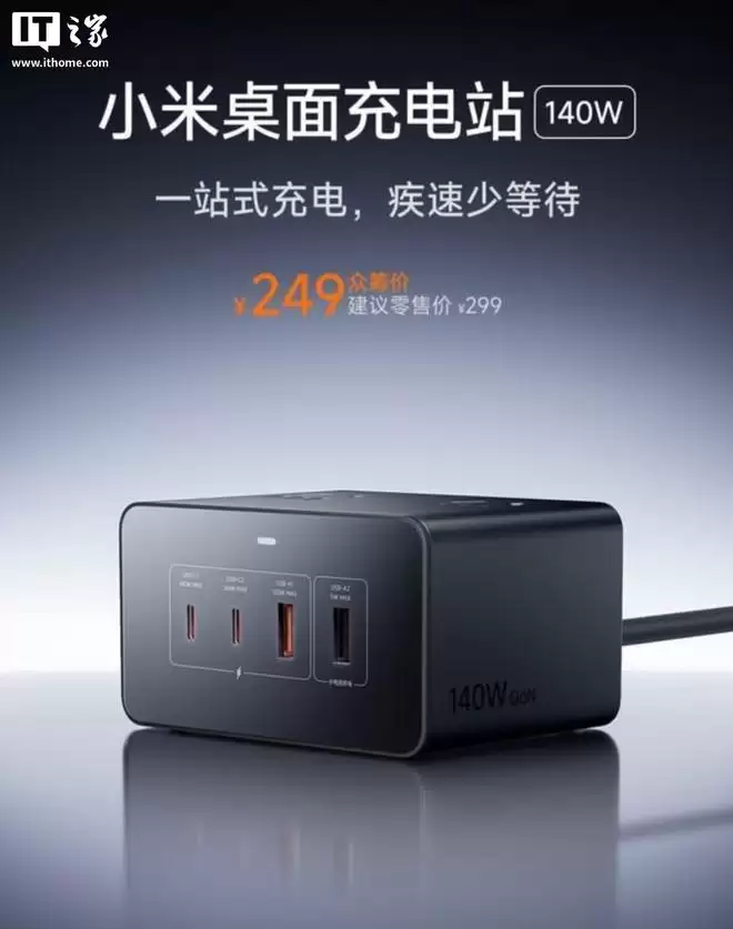 小米140W桌面充电站预249元:2C2A口,支持高速充电