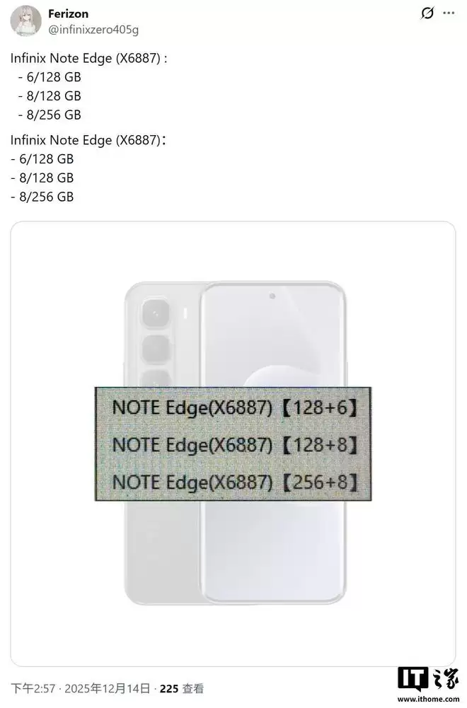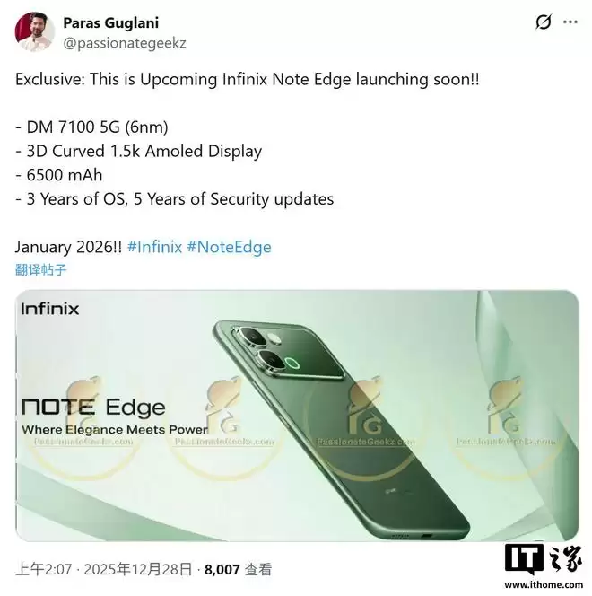 据IT之家12月31日消息,爆料源@Passionategeekz于12月28日在X平台发布推文,分享了一张渲染图。图片显示,传音旗下品牌Infinix正筹备一款名为Note Edge的全新智能手机,并计划于明年1月将其推向市场。