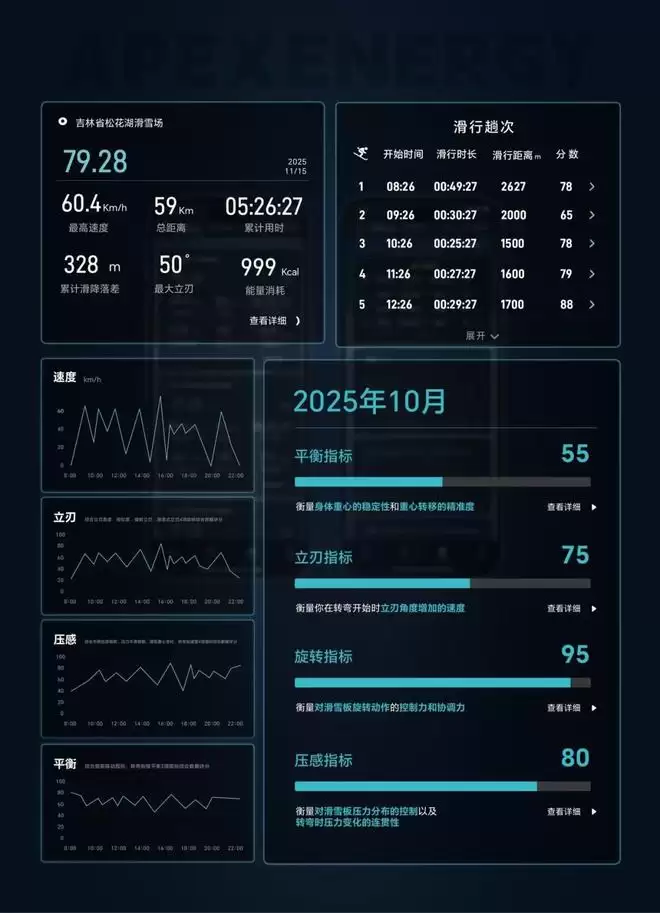 我们现在给用户一些定制化的服务,像这种成长曲线加个人能力分布,都是按月结算的,一次不行,波动太大了。而且我们收集的数据也不光是在雪道上的数据,只要鞋垫连接,我们就会通过GPS、压力传感器进行数据收集,包括穿鞋走路时候的。所以20个小时对于普通用户来说,滑一到两天就差不多能有,就可以算出来用户的滑行倾向了。